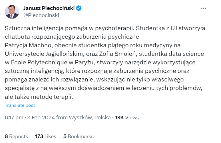 Naszym długoterminowym celem i misją jest poprawić skuteczność terapii poprzez rozpoznawanie zaburzeń psychicznych u pacjentów za pomocą AI i dopasowywanie do nich nurtów terapeutycznych oraz psychoterapeutów. Właśnie w tym celu opublikowaliśmy chatbota opartego na sztucznej inteligencji, który analizuje opis samopoczucia pacjenta, przewiduje objawy zaburzeń psychicznych i dopasowuje najlepszych specjalistów, którzy pracują w metodologiach najskuteczniejszych w leczeniu rozpoznanych zaburzeń psychicznych.